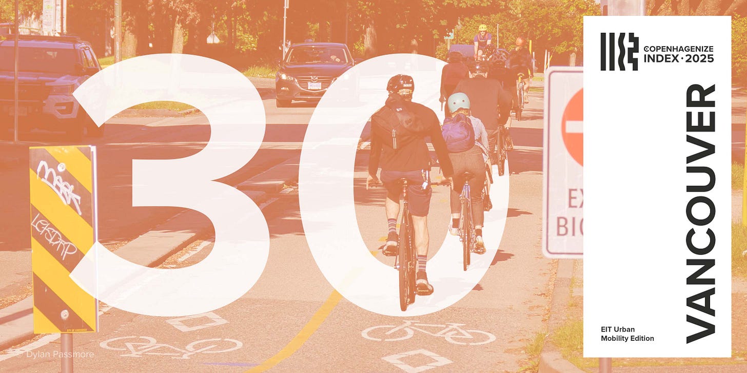 We are reading and sharing the Copenhagenize Index (2025) with excitement. However, we are very disappointed not to see Edmonton (and Toronto) included in the index. It would seem that Edmonton fits your key selection criteria: dramatic mode share increase since 2019, with the added icing of a very strong bike culture, high quality open data from the city, and successive elections giving political mandate and will to expand the cycling infrastructure. The city's goal is to get to 50% of trips by non-automobile mode share by 2040. Since you only included three cities from Canada, you could have included Edmonton and even Toronto and remained in the five-or-under per country limit. Including Montreal makes sense, as does Vancouver, but selecting Quebec City over Edmonton or Toronto does not.