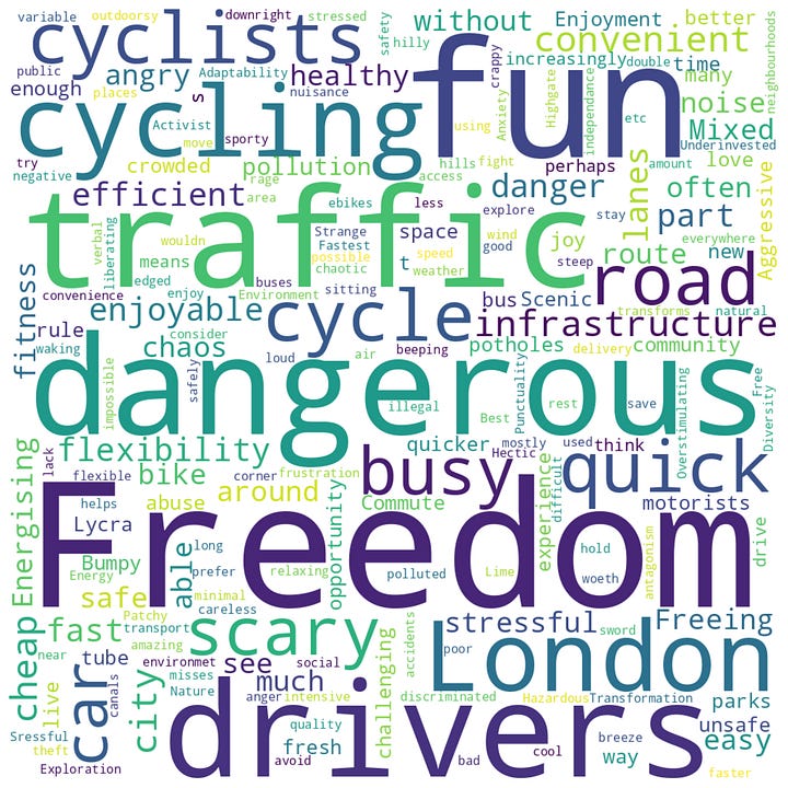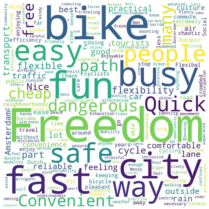 The second research question explored how perceptions of cycling vary by gender and city, with the intention to explore whether different perceptions of cycling lead to different levels of participation. When asked what words came to mind when they thought of cycling in their city, Amsterdam residents used words like easy, quick, and convenient, as seen in Figure 4. In London, despite several positive words appearing, such as freedom, fun and efficient, the most commonly mentioned words were dangerous, scary, and traffic, as highlighted in Figure 3.