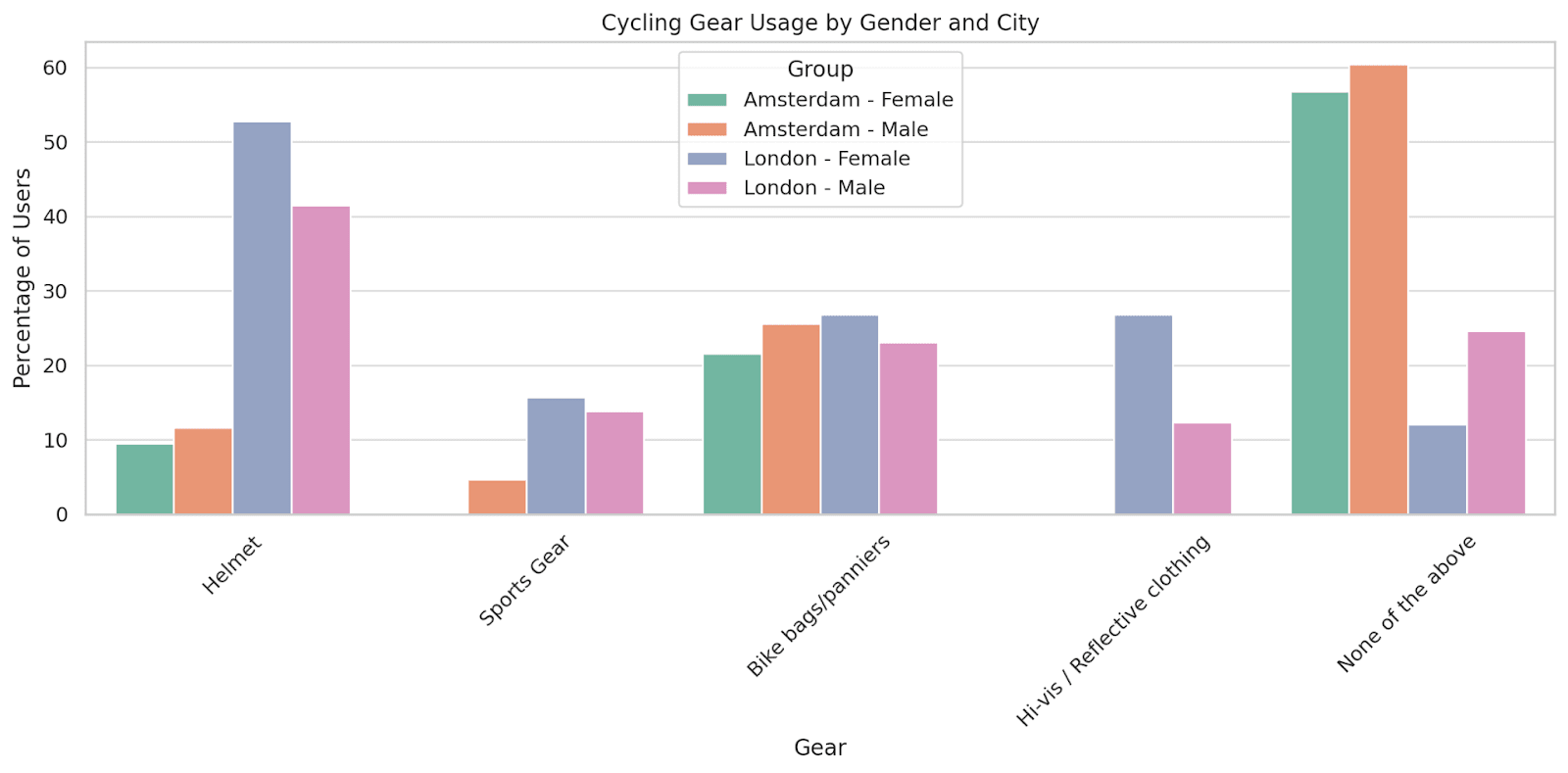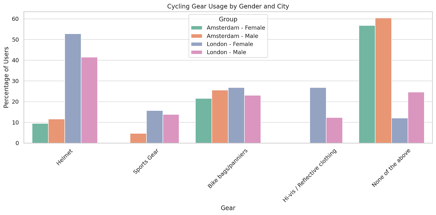 These differences in types of bicycles and cycling gear are highlighted by the graphs below.