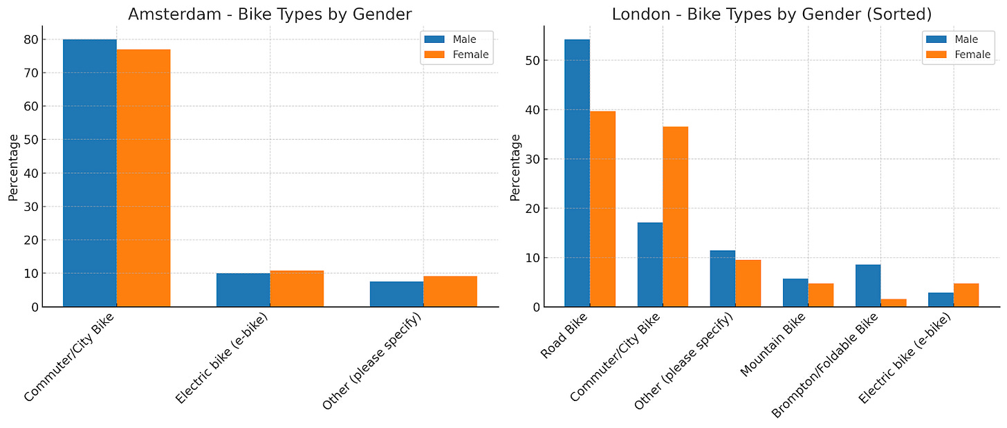 Practical barriers also differ. In Amsterdam, theft and tourist behaviour were mentioned, but these were seen as inconveniences rather than deterrents. Affordable commuter bikes are easy to replace, and cycle paths are universally accessible. In London, fear of bike theft actively discourages cycling, especially since expensive road bikes are more common.